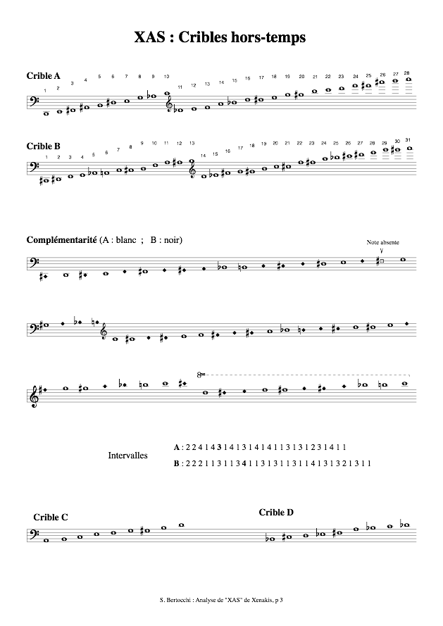 In the quicker figures, thus played and perceived as equal, Xenakis uses fragments of sieves A (soprano) and B (alto), but borrows momentarily from other scales (e.g. C, tenor and baritone).