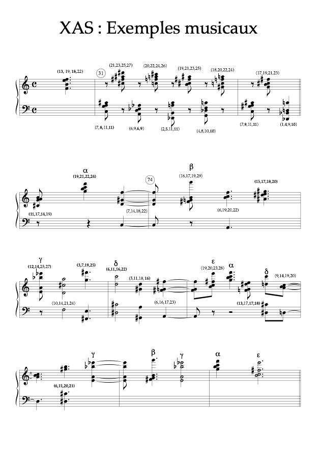 This very animated section is followed by a paradoxically calm passage that I call "fixed Ataxia" (bars 66-73, t = 5'35" O = -3) based on a particularly complicated rhythm of 14 against 15, the soprano and baritone on one hand, the alto and tenor on the other hand, each instrument playing alternately with his vis-à-vis. Supporting this rhythmic "unstable stability" are violent dynamic (p to fff) and tessitura changes. I think this passage is representative of a search for a "partial," or controlled, disorder. The following passage (bars 73-81, t = 6'08 ", O =. - 2) is another form of altered recall based on the organ sounds of bar 31, this time expanded over very long values, based on complex aggregates juxtaposing and superimposing the two original sieves (see musical examples). This section then connects to bars 81-87, which opens with the presence of shrill cries, followed by low sounds and multiphonics. This is both a reminder of the 3rd rarefaction and an anticipation of the end of the piece.