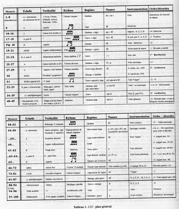 But the exploration of the unheard by Xenakis is not only based on the development of particular techniques (the effect of which would soon be outdated), but also in an unconventional use of already known principles. Seeking to identify, through the study of this piece, the practical implications of Xenakis' work on the notions of order and disorder, I had to define a rating scale of the degree of order from O = -5 to +5, essentially based on psycho-acoustic sensations. This scale is based on several concepts: