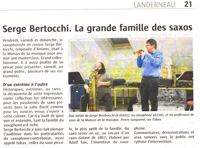 C'est à la Maison de la musique que l'on doit la venue de Serge Bertocchi à Landerneau. Officiant actuellement au Conservatoire d'Amiens, le saxophoniste, interprète et compositeur, est habitué à faire voyager ses instruments dans toute l'Europe, en Asie ou encore en Amérique du Nord. Lauréat de concours nationaux et internationaux, titulaire du premier prix de saxophone et de musique de chambre du Conservatoire national supérieur de musique et danse de Paris... Bref, Serge Bertocchi est une pointure. « Dans le sax, c'est un touche-à-tout », confie Pierre Langonné, professeur de saxophone à la Maison de la musique. « Il a créé près de 150 pièces, est l'auteur de recueils pédagogiques sur la musique contemporaine et c'est aussi un collectionneur. Il est spécialisé dans les instruments historiques, extrêmes et rares », poursuit-il. Demain, à l'occasion d'un premier concert, il présentera au grand public plusieurs de ses instruments. Comme le Tubax, un modèle offrant des sonorités extrêmement graves, ou encore le Soprillo, un minuscule saxo de 4 cm de long.