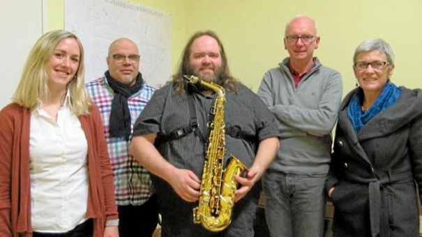 Florence Balcon et Pierre-Antoine Colas de l'école de musique ; Pierre Langonné, professeur de saxophone et chef d'orchestre de l'Harmonie de l'Elorn ; Christian Abiven, président de l'Harmonie de l'Élorn ; Marie-France Trmal, adjointe déléguée à la culture, organisateurs de l'événement. |