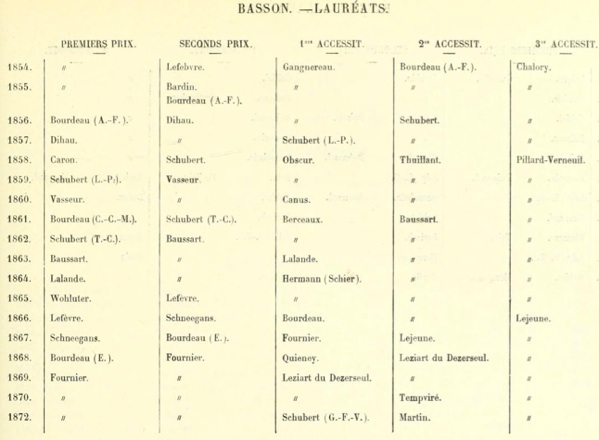 Résultats des classes de basson sur la période 1857-1870 : (38 réc. sur 13 Concours)