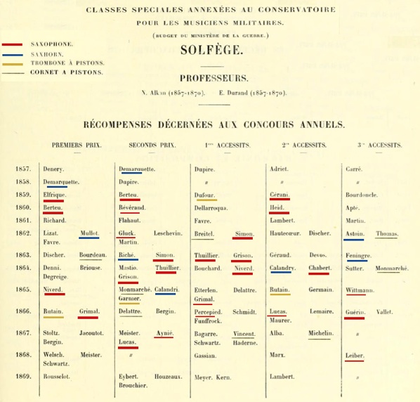 Voir document ci-dessus : soulignés en rouge, élèves saxophonistes, en bleu les joueurs de saxhorn, en ocre les trombonistes et souligné en noir les cornettistes.