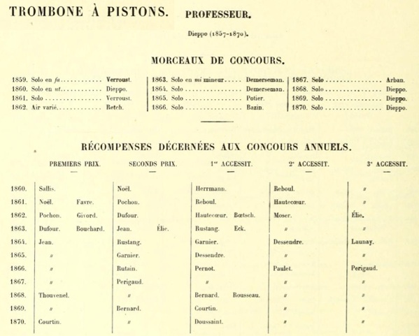 Les autres élèves (non soulignés) ont parfois obtenu des récompenses (mineures) avec d'autres classes d’instruments à vent (3 hautbois, 2 flutes, 1 clarinette, 1 cor ...) mais la plupart sont "spécialistes". On peut supposer que leur niveau instrumental ne leur a pas permis de réussir le concours d’entrée du conservatoire.