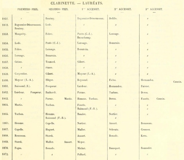Résultats des classes de clarinette sur la période 1857-1870 : (64 réc. sur 13 Concours)